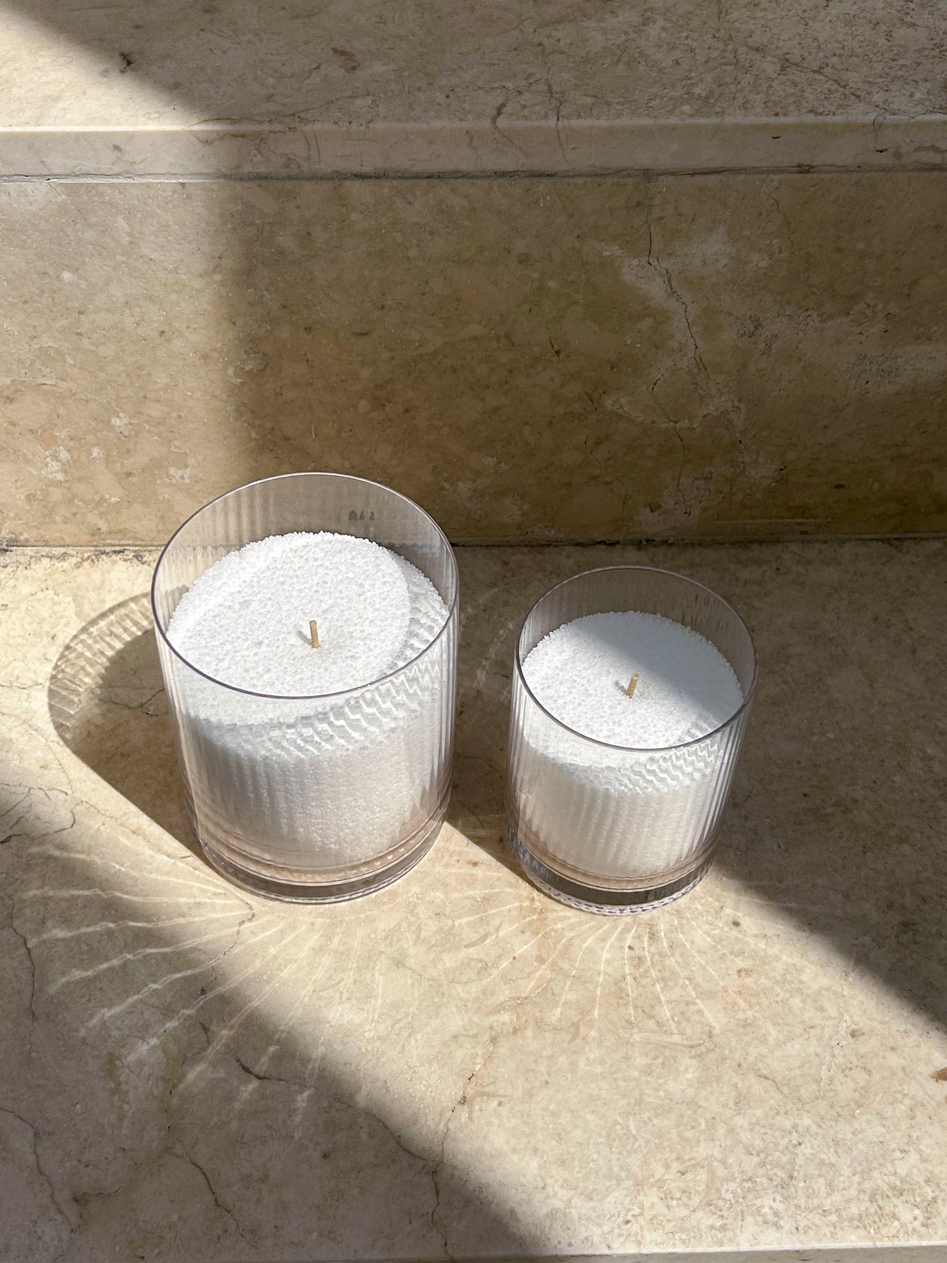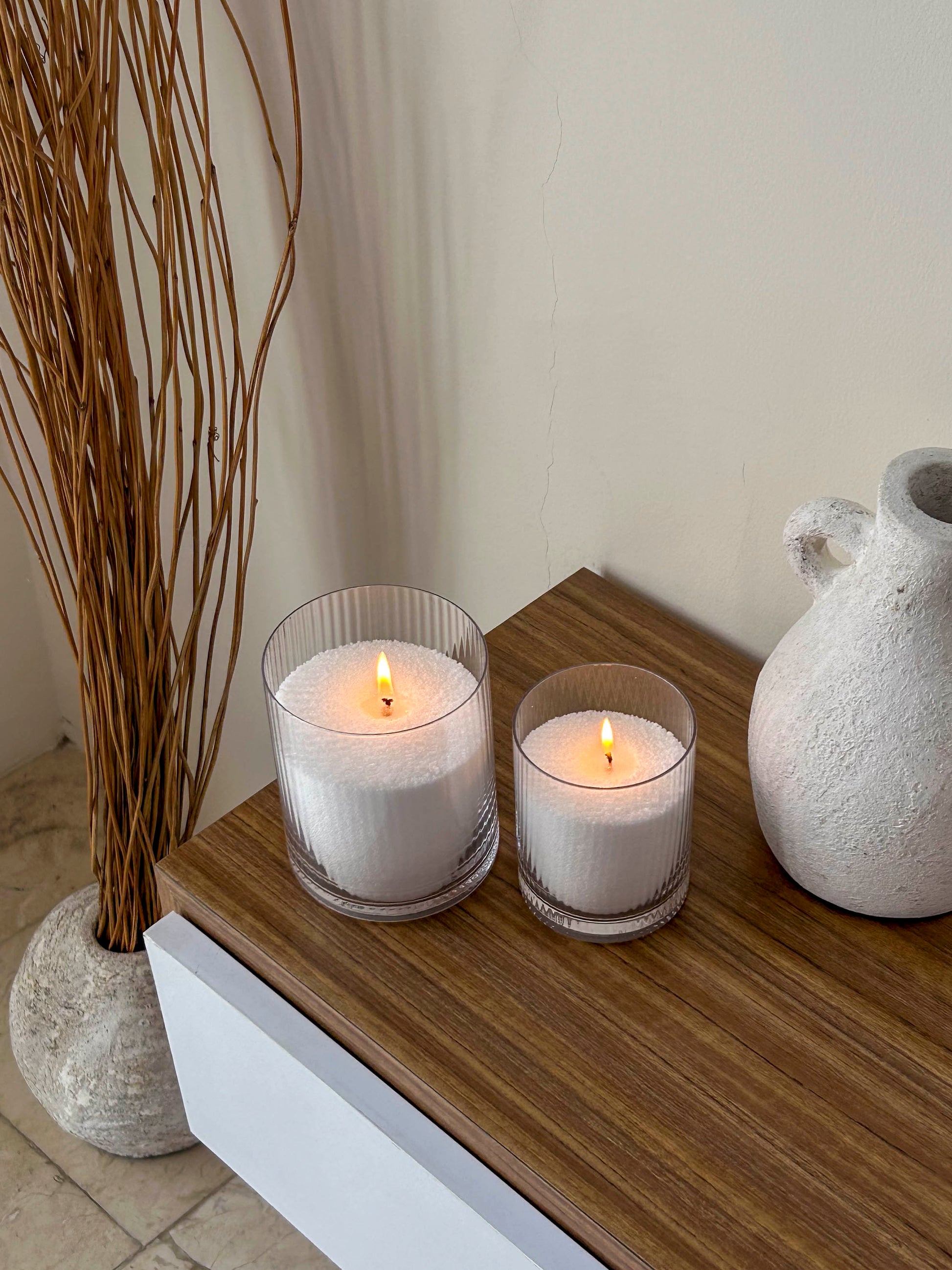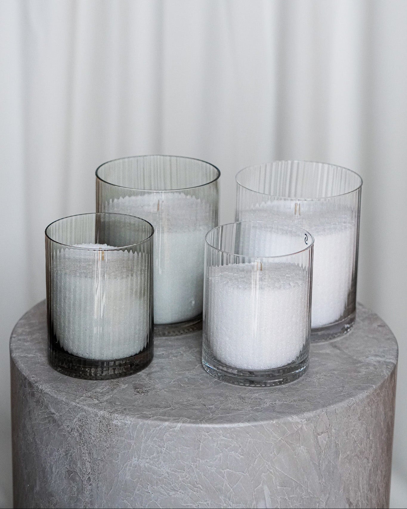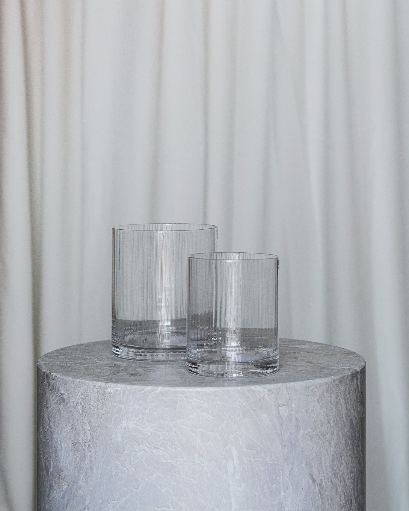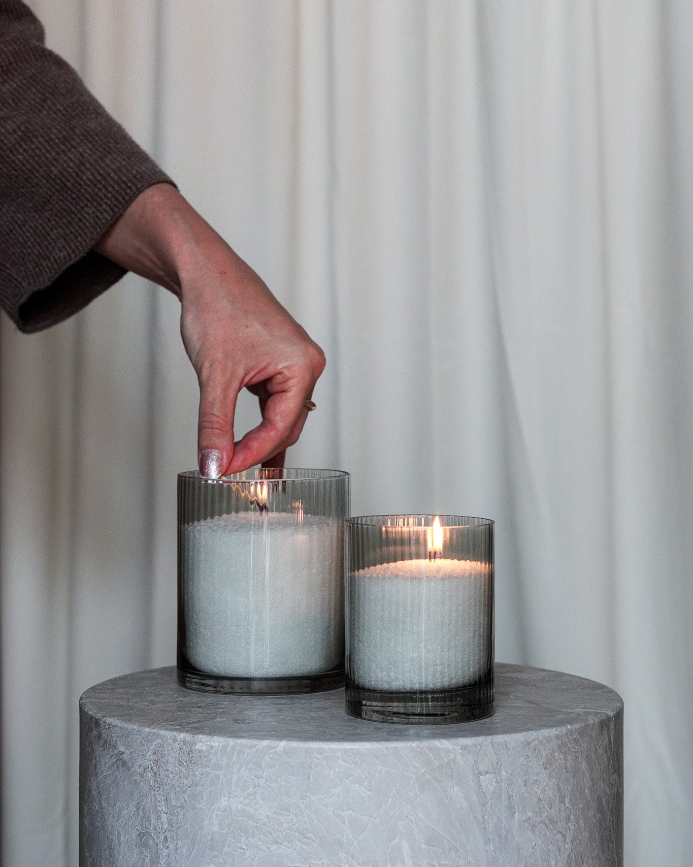 Skap en elegant og tidløs stemning med Ramsjö lyslykter fra Storefactory Scandinavia i størrelse liten og stor, perfekt for å fremheve skjønnheten i Vela Pearls. Den stripete glassoverflaten gir et sofistikert uttrykk, samtidig som det håndlagde glasset gir hver lykt et unikt preg.