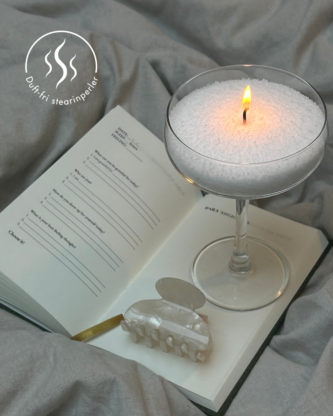 Hell perlene over i en valgfri beholder som tåler høy varme og har en diameter på minimum 8cm. Plasser en veke i midten, ca. 0,5 cm opp fra perlene, og tenn på. Slukk lyset når du er ferdig med det. Se vår brukerveiledning for video og mer informasjon.